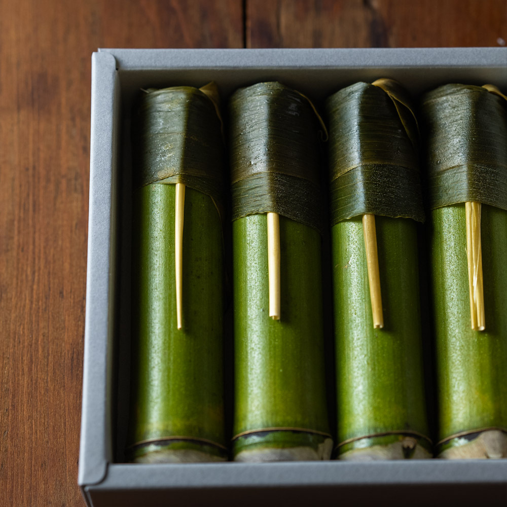 裝在翠綠竹筒裡的紅豆水羊羹,風味清爽不甜膩